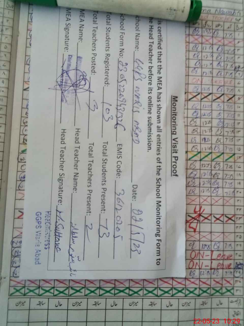 | Attendance Register | Head Teacher | MEA with School | Visit Proof |