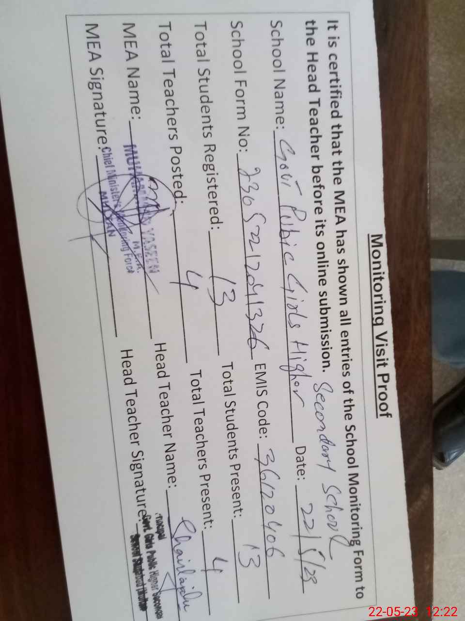 | Attendance Register | Head Teacher | MEA with School | Visit Proof |
