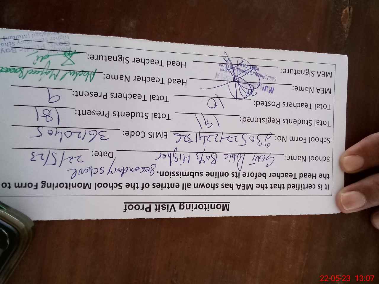 | Attendance Register | Head Teacher | MEA with School | Visit Proof |