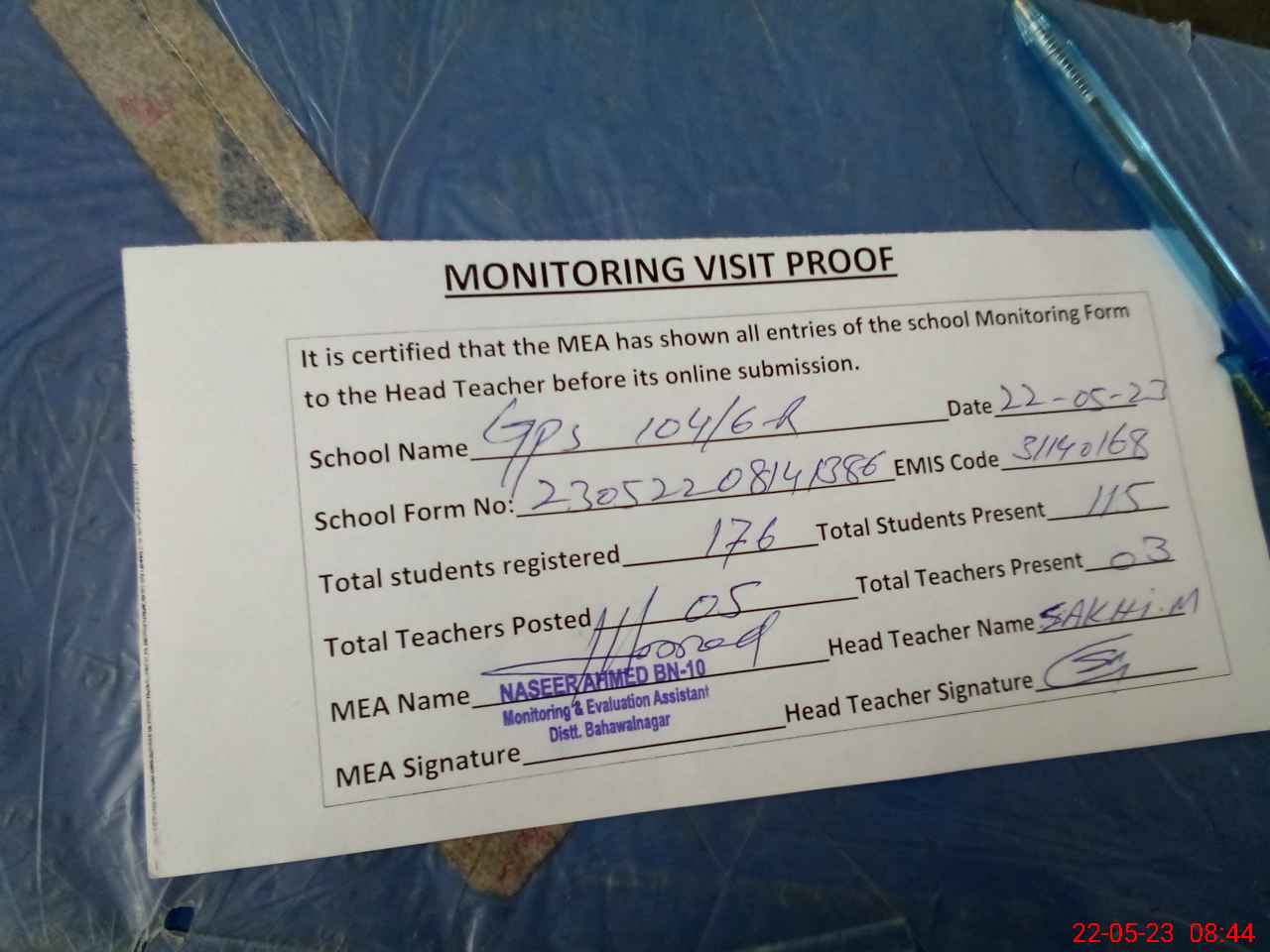 | EMIS Code: 31140168 | Name of School: GPS CHAK NO 104/6-R | |||