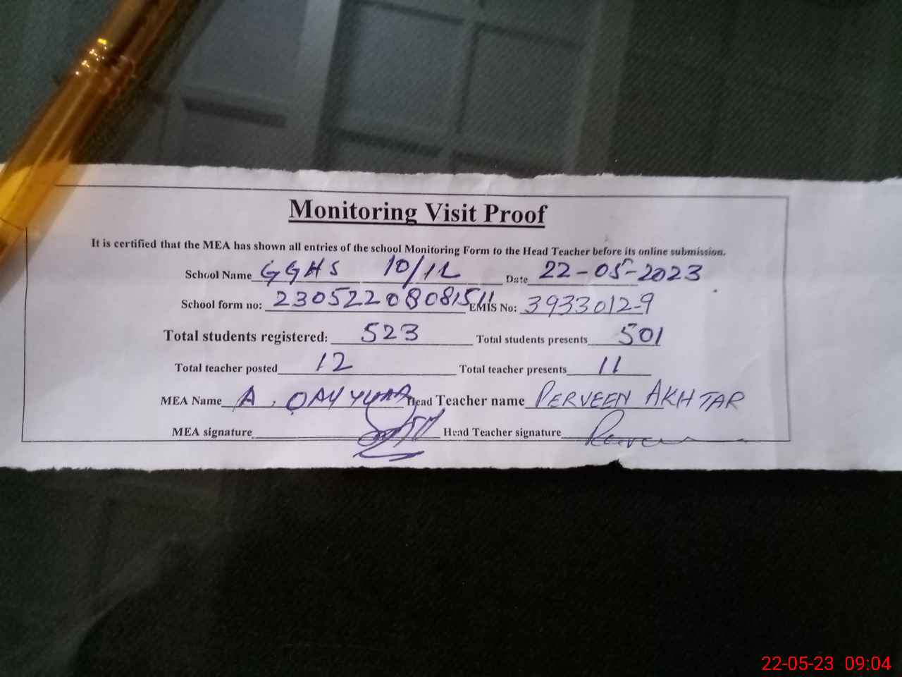 | Attendance Register | Head Teacher | MEA with School | Visit Proof |