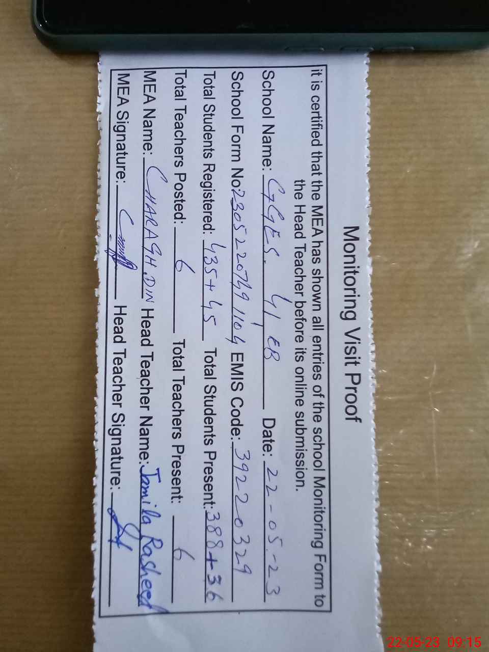 | Attendance Register | Head Teacher | MEA with School | Visit Proof |