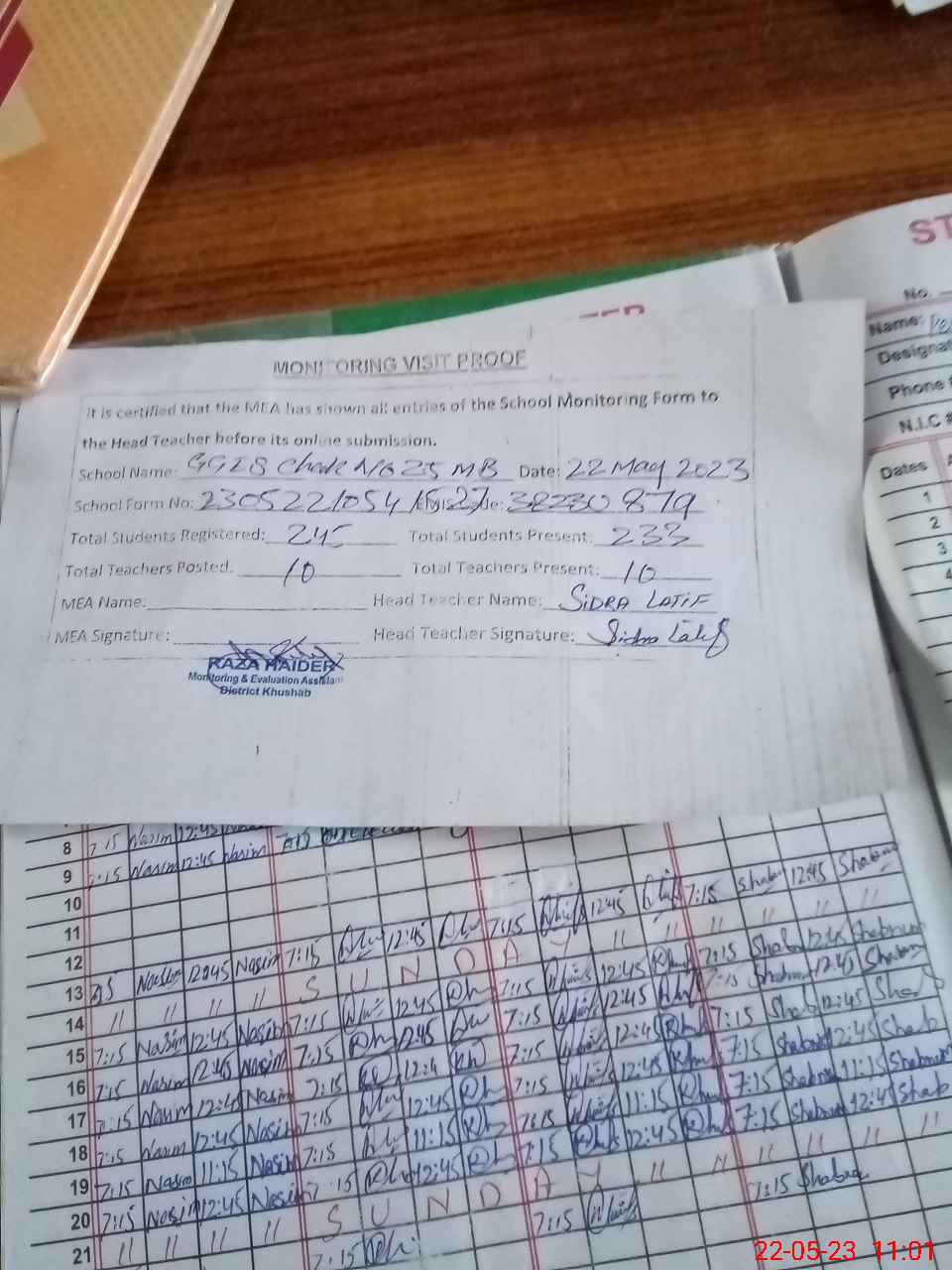 | Attendance Register | Head Teacher | MEA with School | Visit Proof |