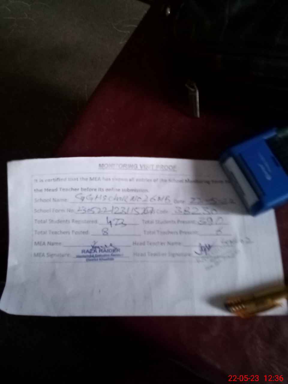| Attendance Register | Head Teacher | MEA with School | Visit Proof |