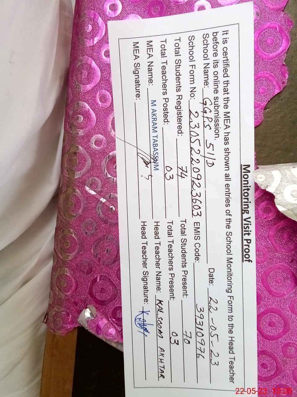 | Certified that this School was Inspected by the Undersigned MEA/DMO Today and the Information Stated Above is as Per Record. | |||||