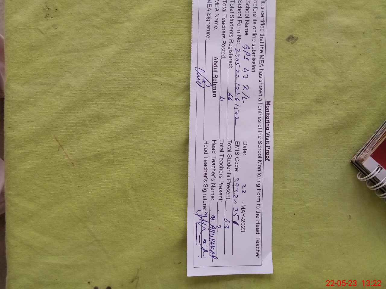 | Attendance Register | Head Teacher | MEA with School | Visit Proof |