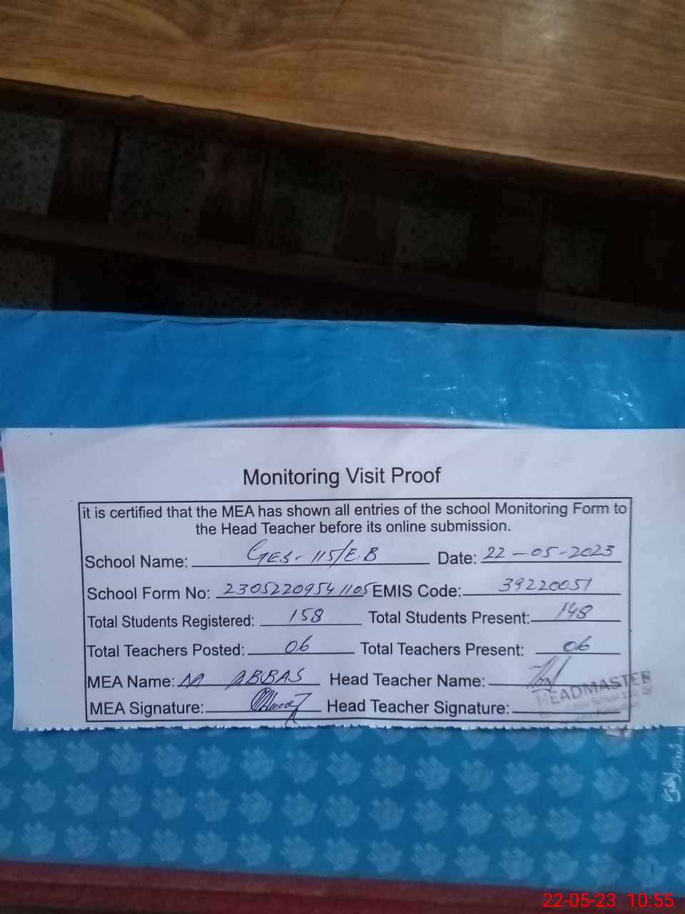 | Attendance Register | Head Teacher | MEA with School | Visit Proof |