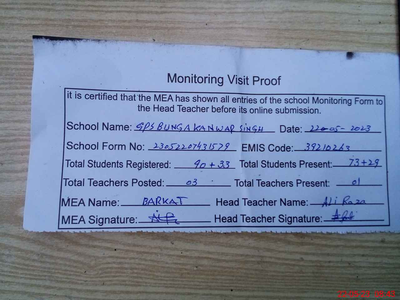 | EMIS Code: 39210263 | Name of School: GPS BUNGA KANWAR SINGH | |||