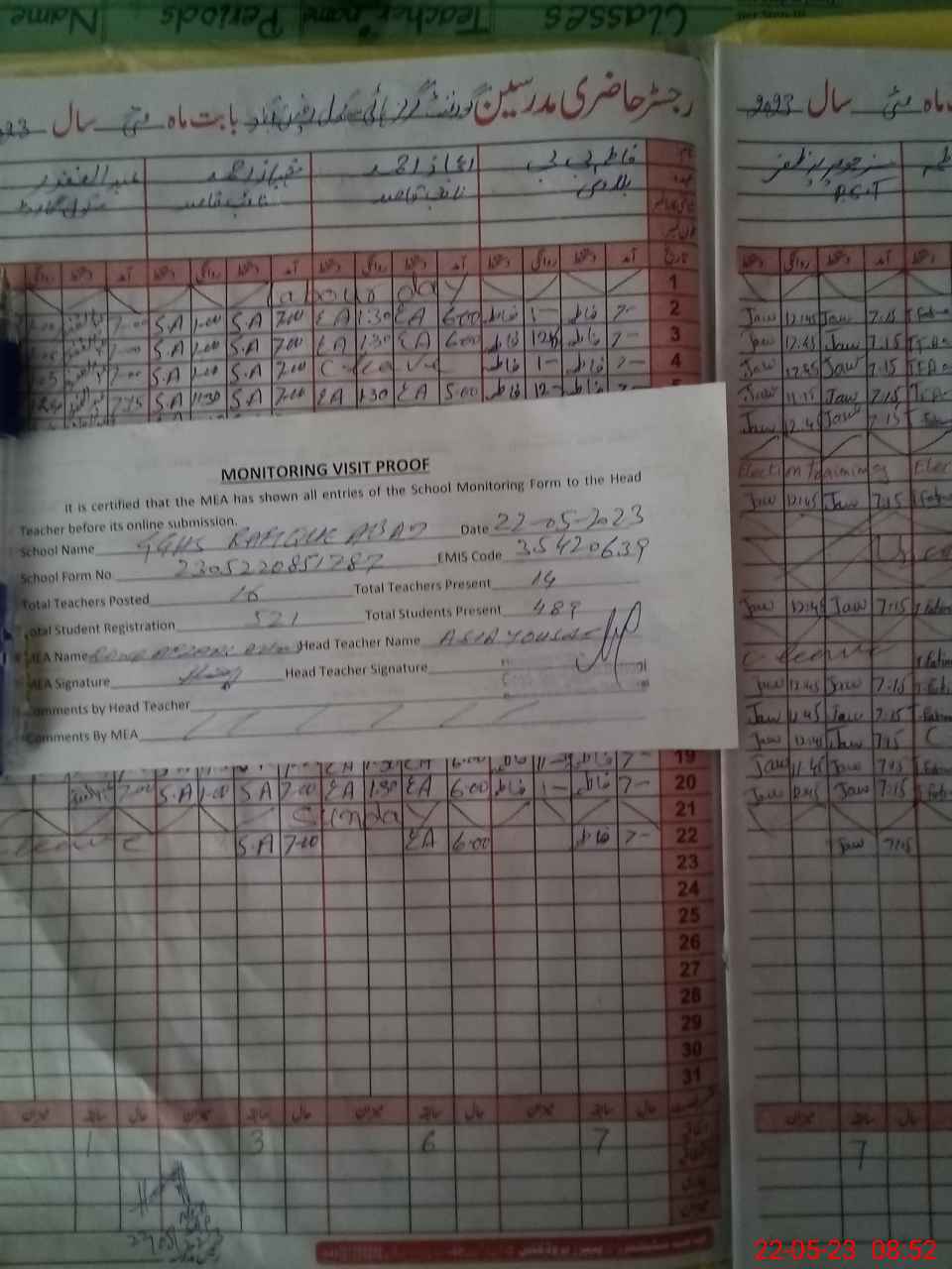 | Attendance Register | Head Teacher | MEA with School | Visit Proof |