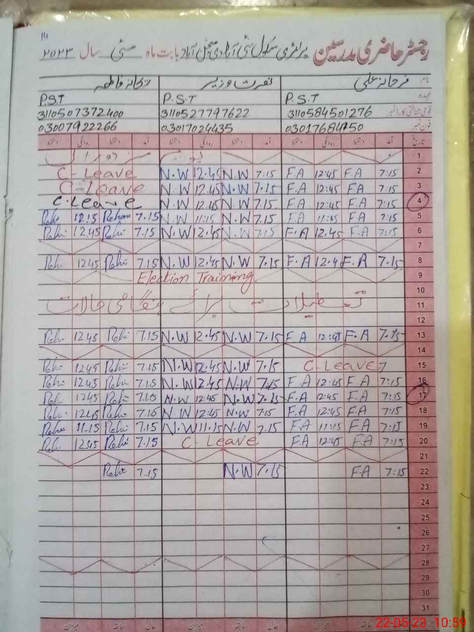 | CNIC | Full Name | Designation | R/C | Absence During Last Calender Month |