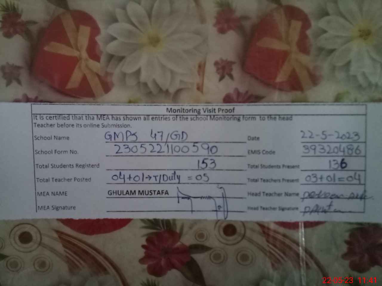 | Attendance Register | Head Teacher | MEA with School | Visit Proof |