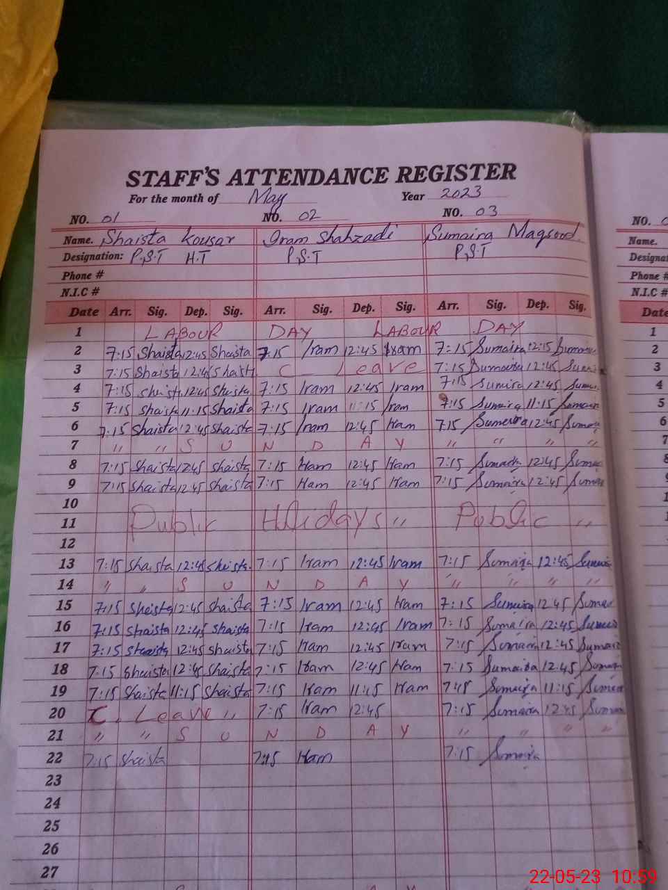 | CNIC | Full Name | Designation | R/C | Absence During Last Calender Month |