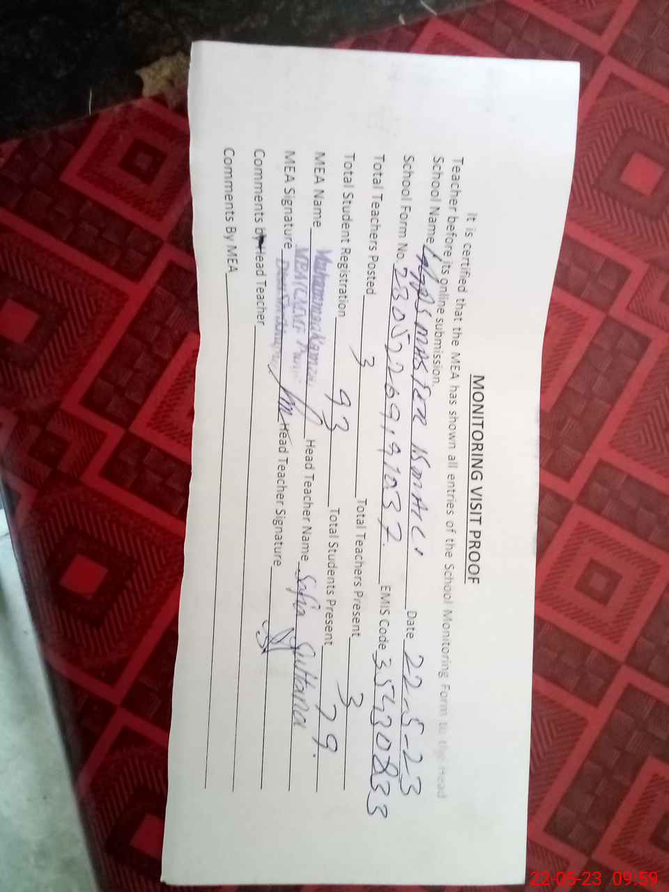 | Attendance Register | Head Teacher | MEA with School | Visit Proof |