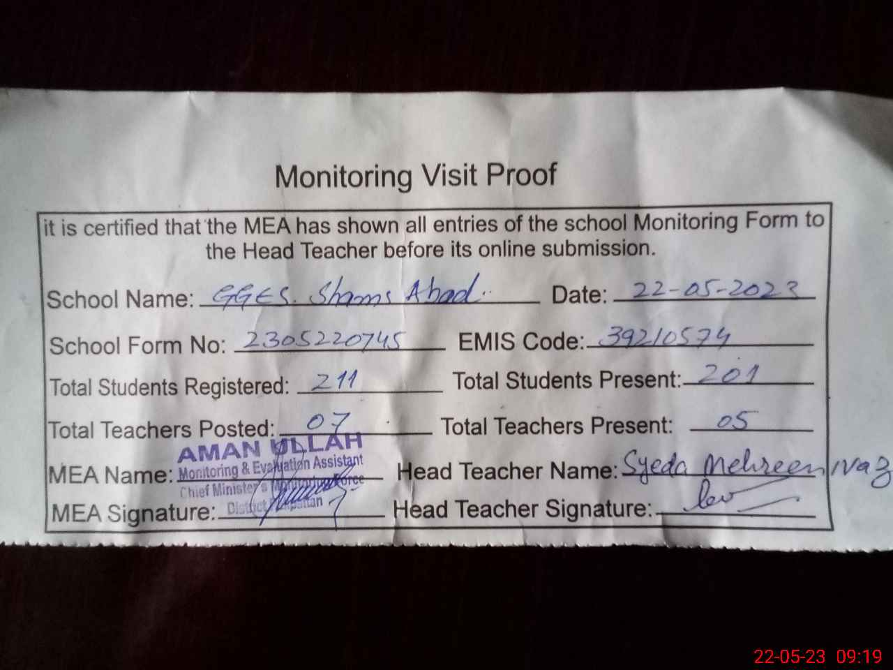 | Attendance Register | Head Teacher | MEA with School | Visit Proof |