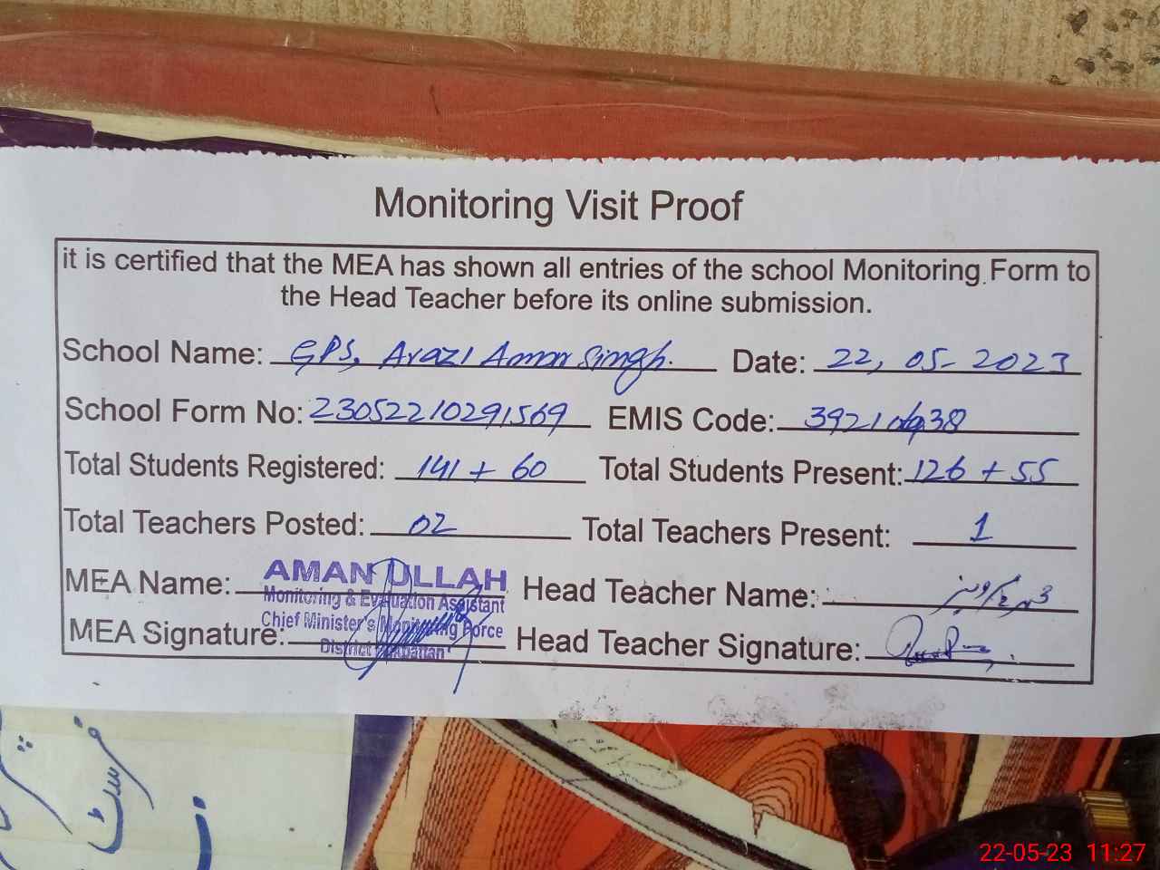 | EMIS Code: 39210438 | Name of School: GPS ARAZI AMAR SINGH | |||