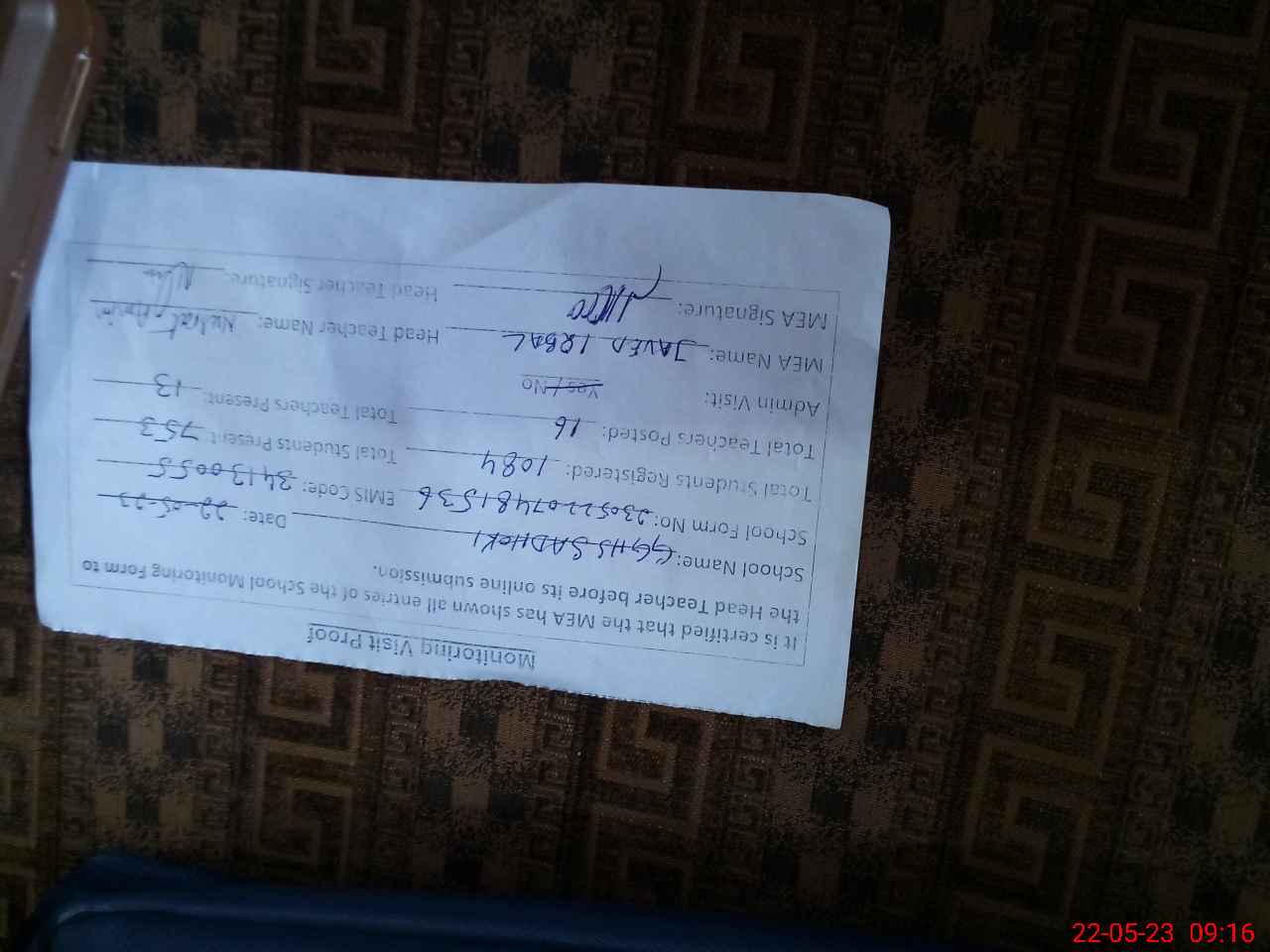 | Name: NU**** AM**** Designation: (School Headmaster's/Headmistress's) SST INC HEAD Phone/Cell Number: 03**** |