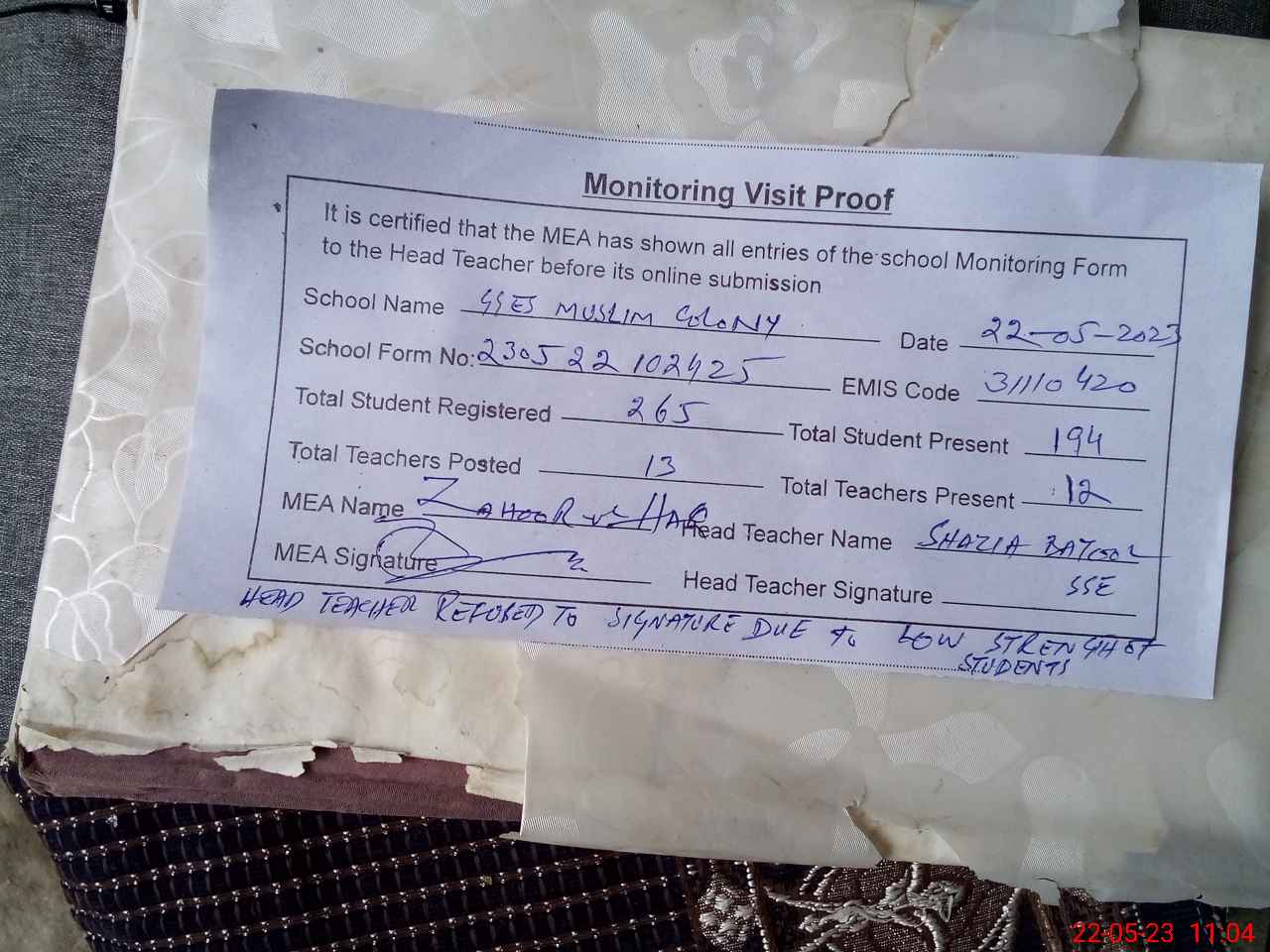 | Attendance Register | Head Teacher | MEA with School | Visit Proof |