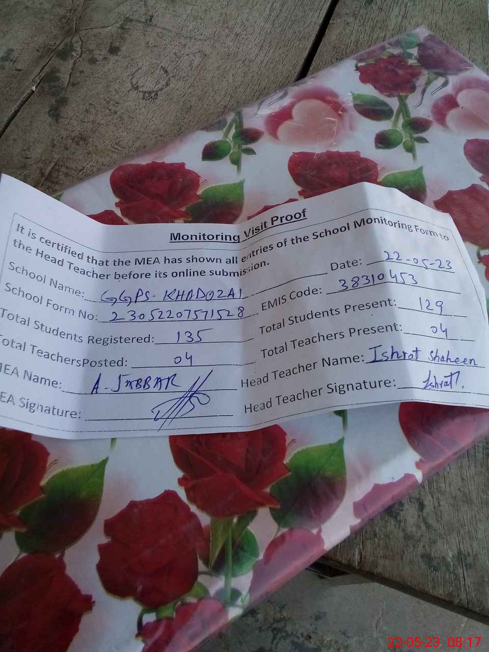 | Attendance Register | Head Teacher | MEA with School | Visit Proof |