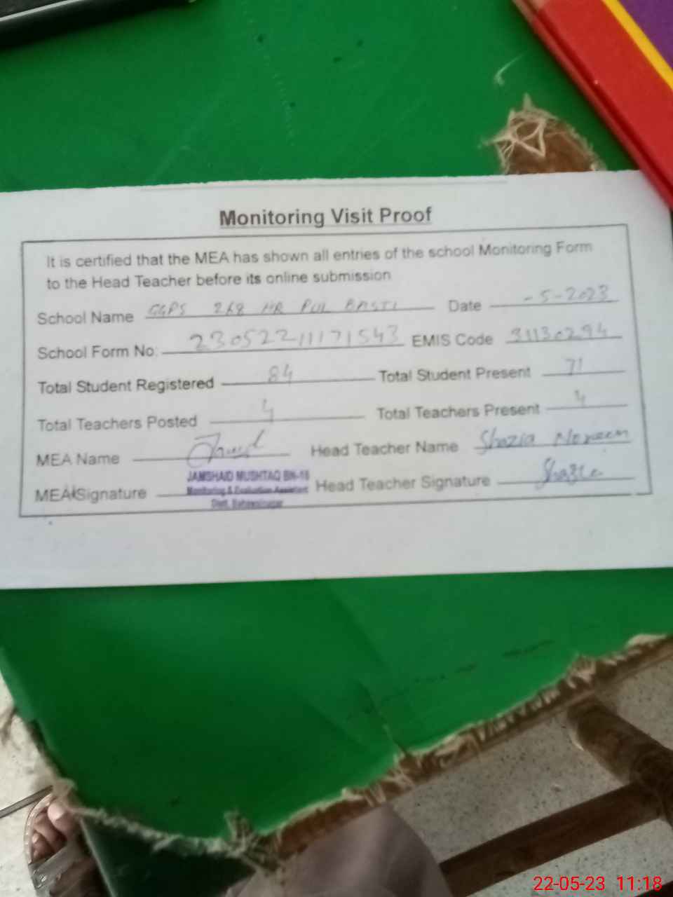 | Attendance Register | Head Teacher | MEA with School | Visit Proof |