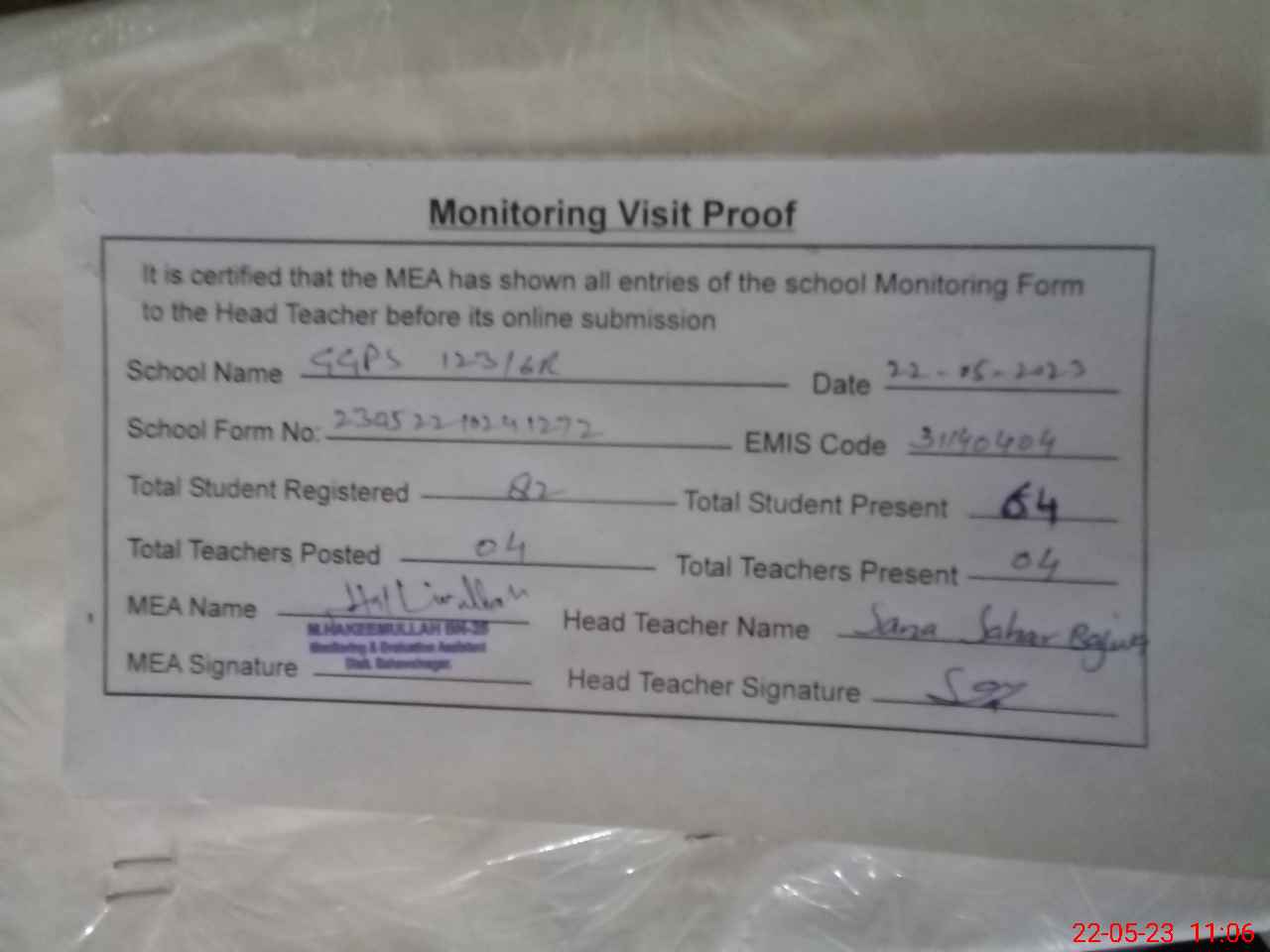 | Attendance Register | Head Teacher | MEA with School | Visit Proof |