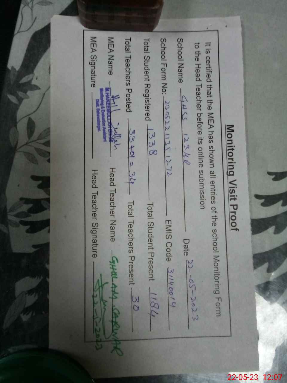 | Attendance Register | Head Teacher | MEA with School | Visit Proof |