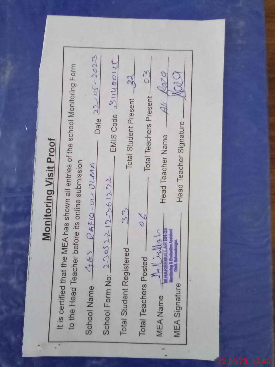| Attendance Register | Head Teacher | MEA with School | Visit Proof |