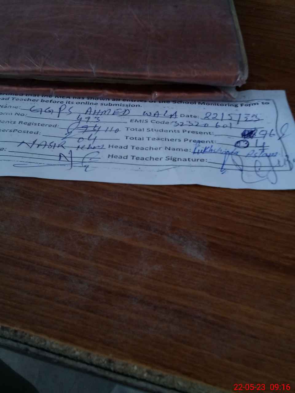 | Attendance Register | Head Teacher | MEA with School | Visit Proof |