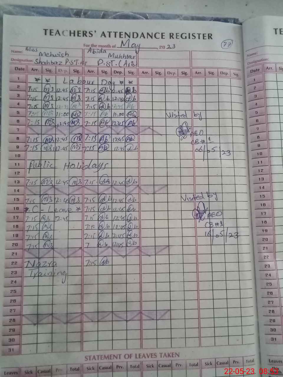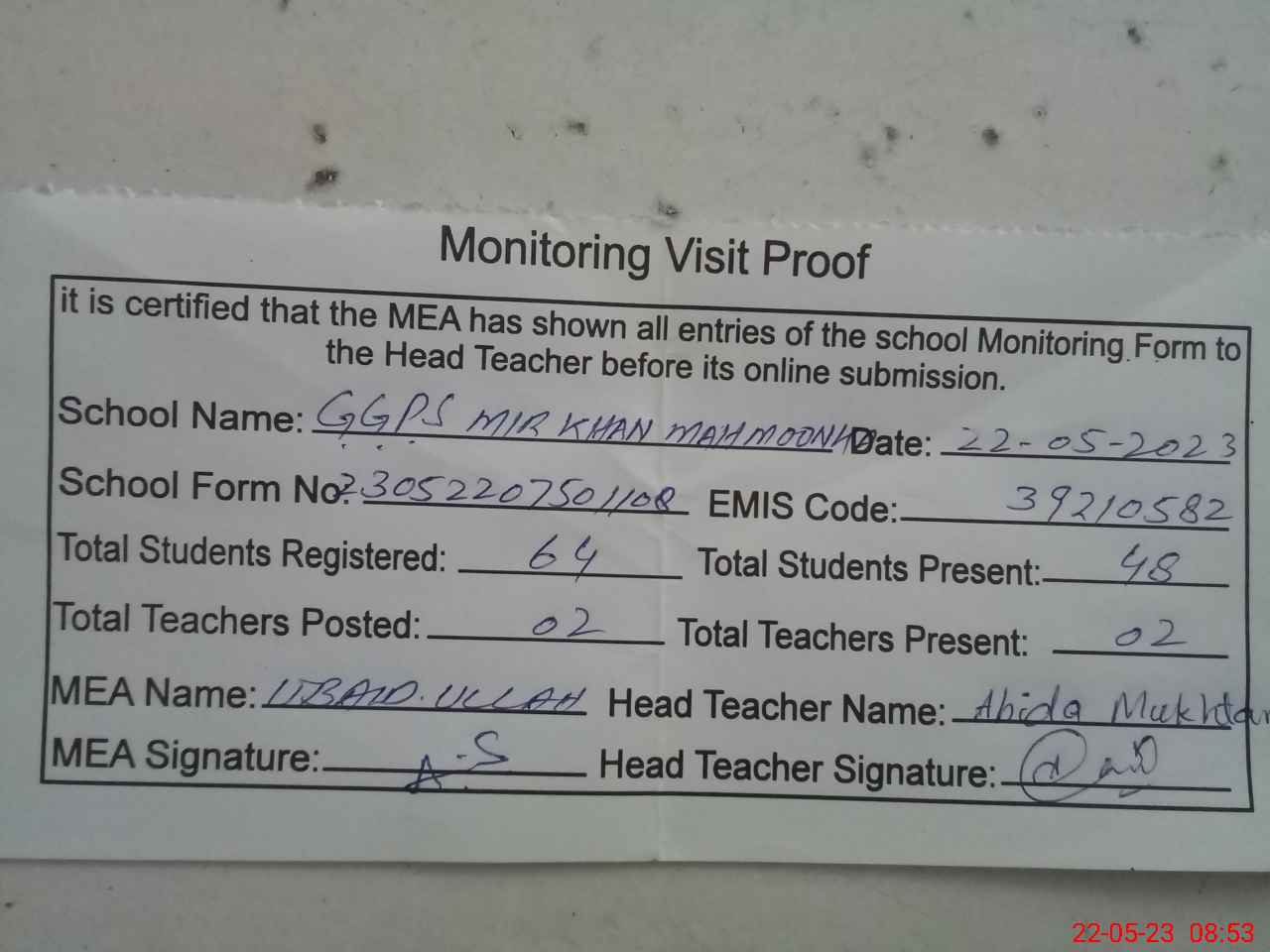 | Attendance Register | Head Teacher | MEA with School | Visit Proof |
