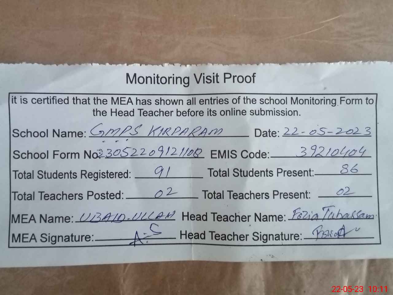 | Attendance Register | Head Teacher | MEA with School | Visit Proof |