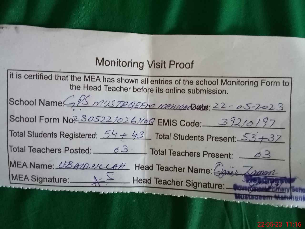 | EMIS Code: 39210197 | Name of School: GPS MUSTAQEEM MAHMONKA P/O PAKPATTAN | |||