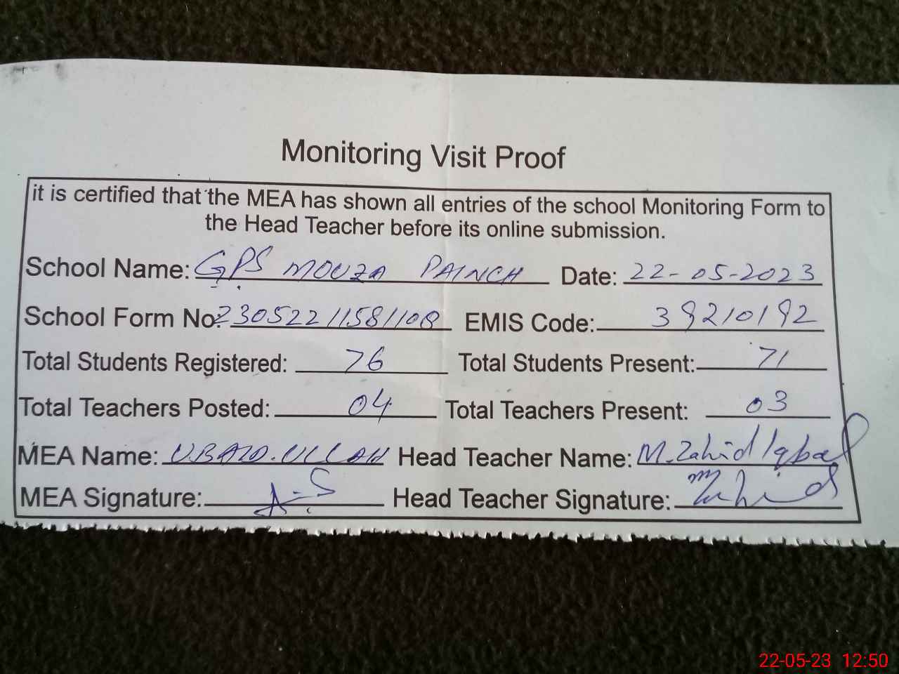 | Attendance Register | Head Teacher | MEA with School | Visit Proof |
