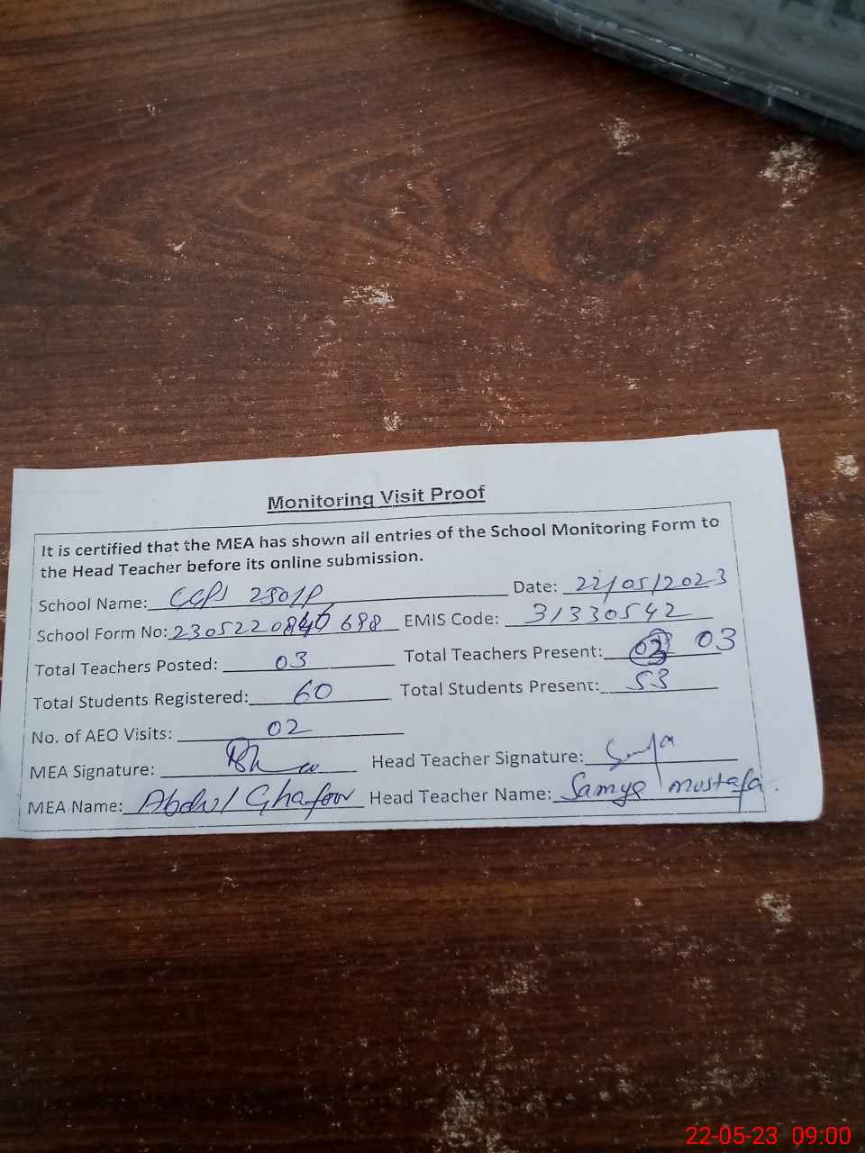 | Attendance Register | Head Teacher | MEA with School | Visit Proof |