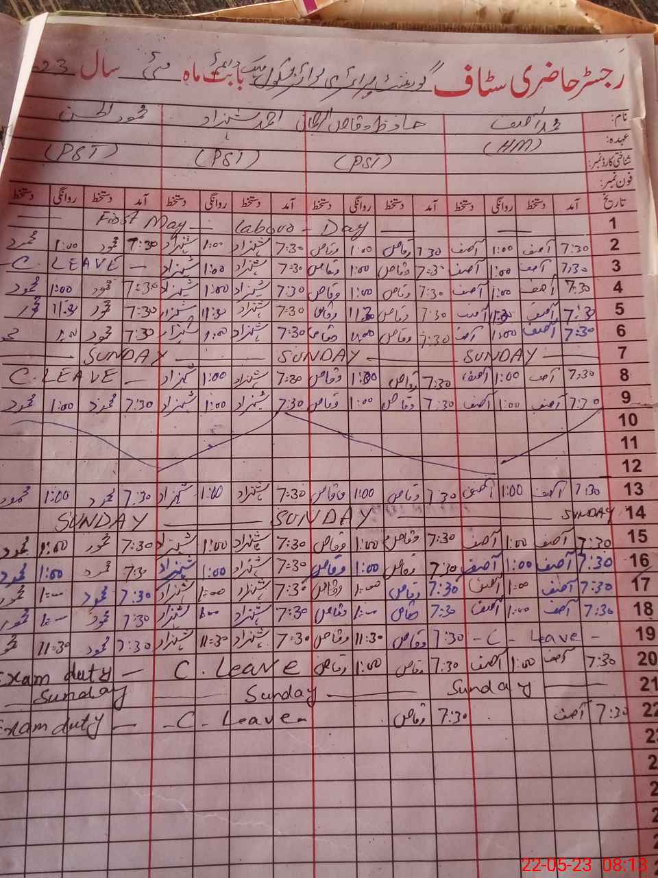 | CNIC | Full Name | Designation | R/C | Absence During Last Calender Month |