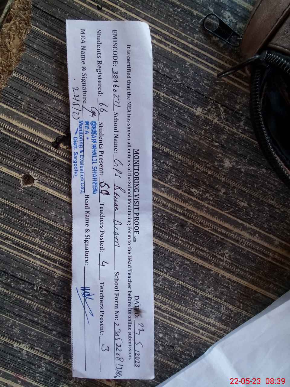 | Attendance Register | Head Teacher | MEA with School | Visit Proof |