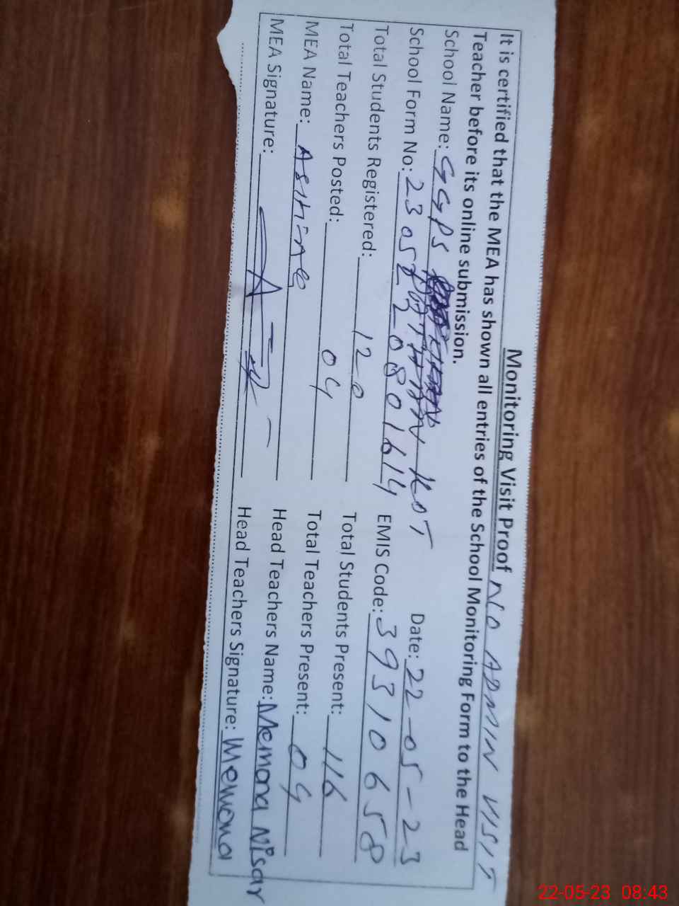 | Attendance Register | Head Teacher | MEA with School | Visit Proof |