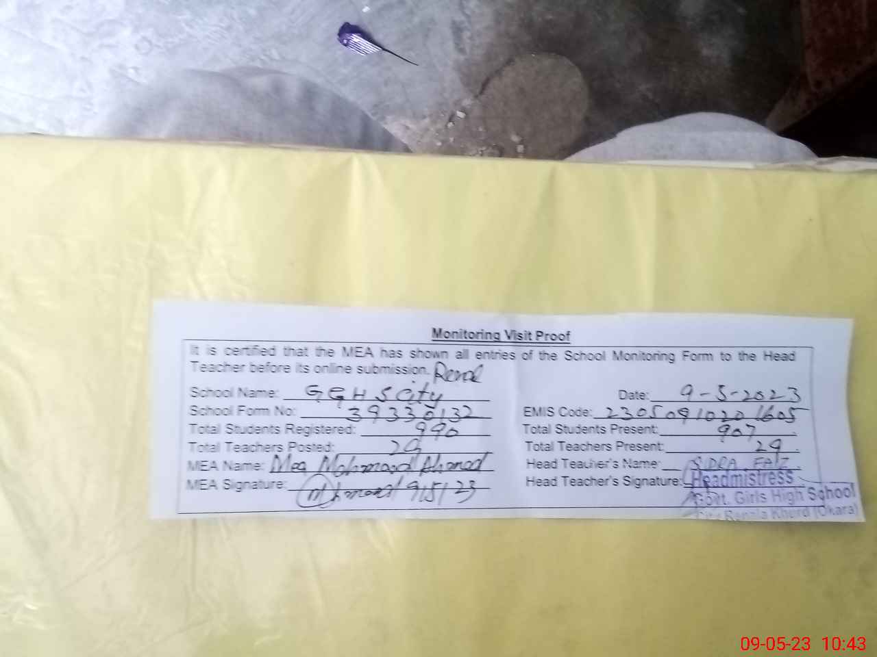 | EMIS Code: 39330132 | Name of School: GGHS RENALA CITY | |||