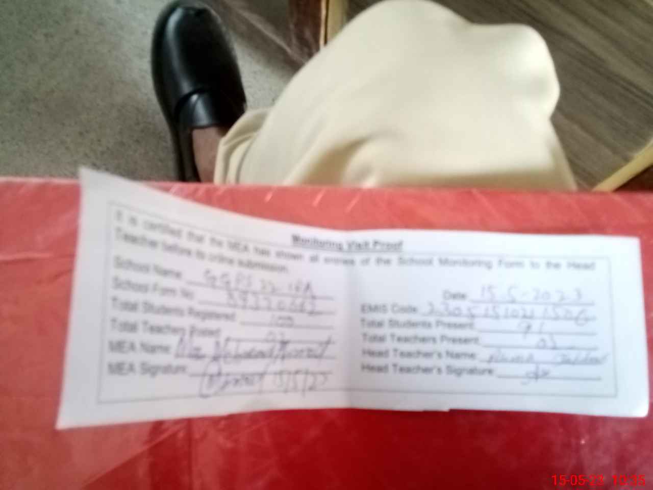 | Attendance Register | Head Teacher | MEA with School | Visit Proof |