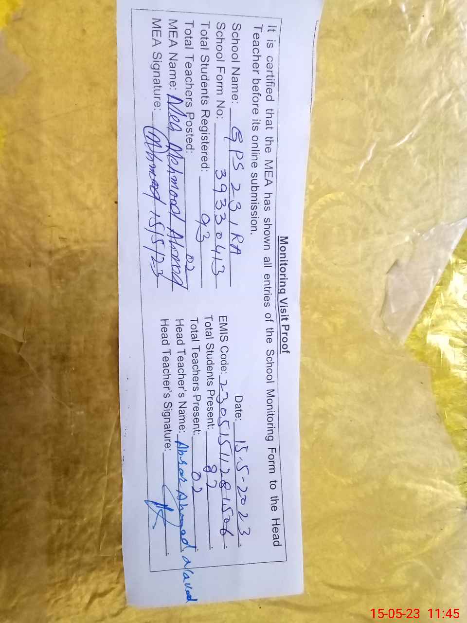 | Attendance Register | Head Teacher | MEA with School | Visit Proof |