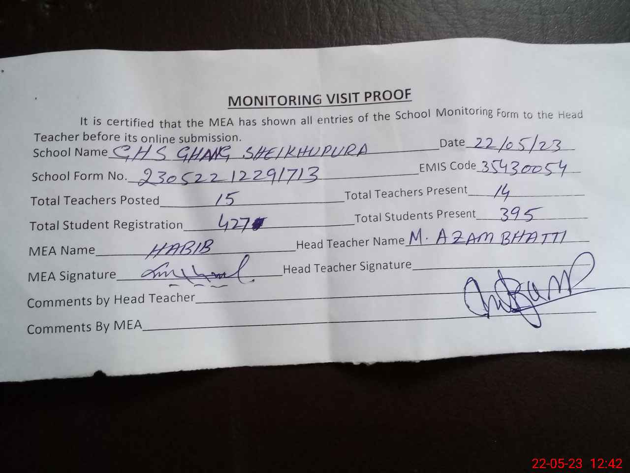 | Attendance Register | Head Teacher | MEA with School | Visit Proof |