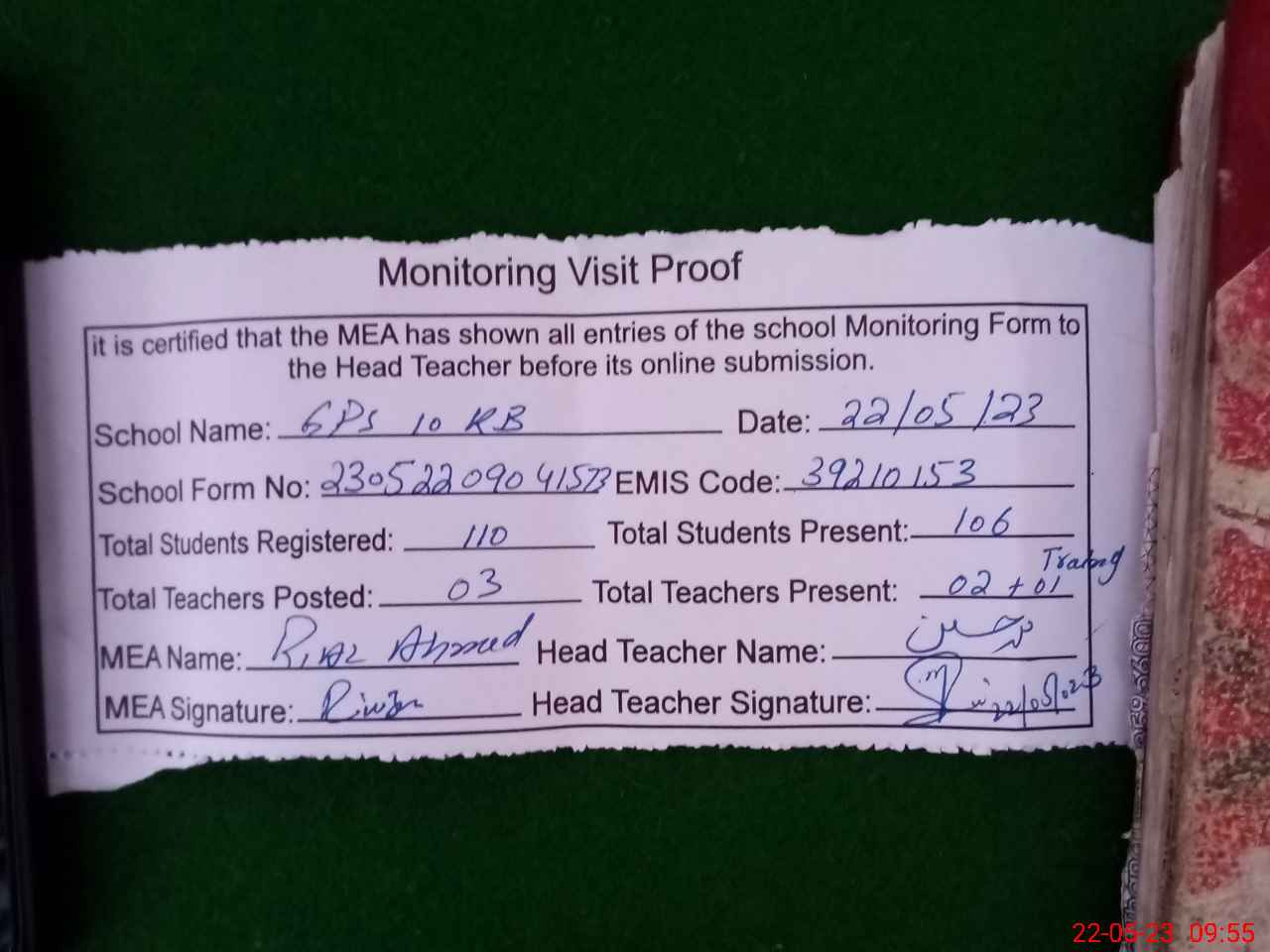 | Attendance Register | Head Teacher | MEA with School | Visit Proof |
