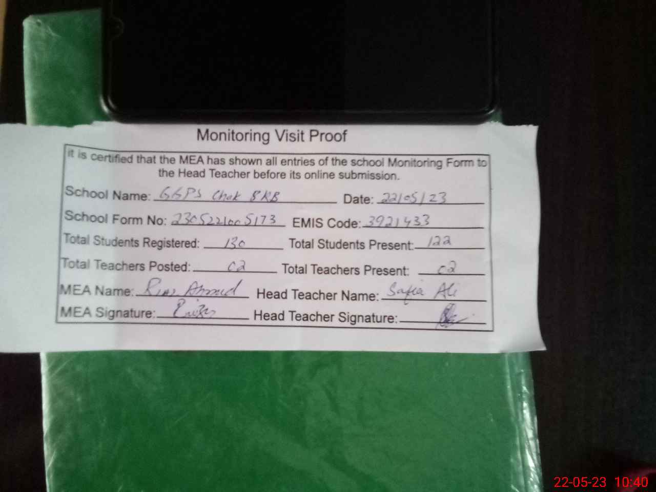 | Attendance Register | Head Teacher | MEA with School | Visit Proof |