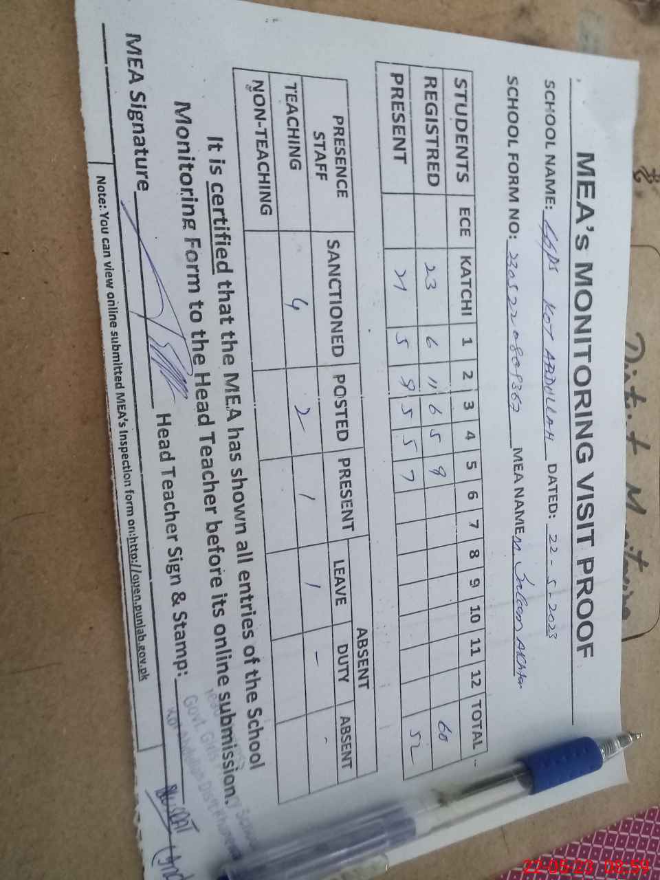 | Attendance Register | Head Teacher | MEA with School | Visit Proof |