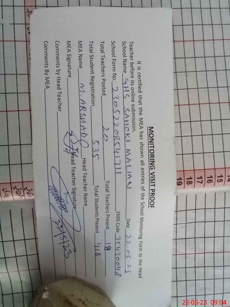 | Attendance Register | Head Teacher | MEA with School | Visit Proof |