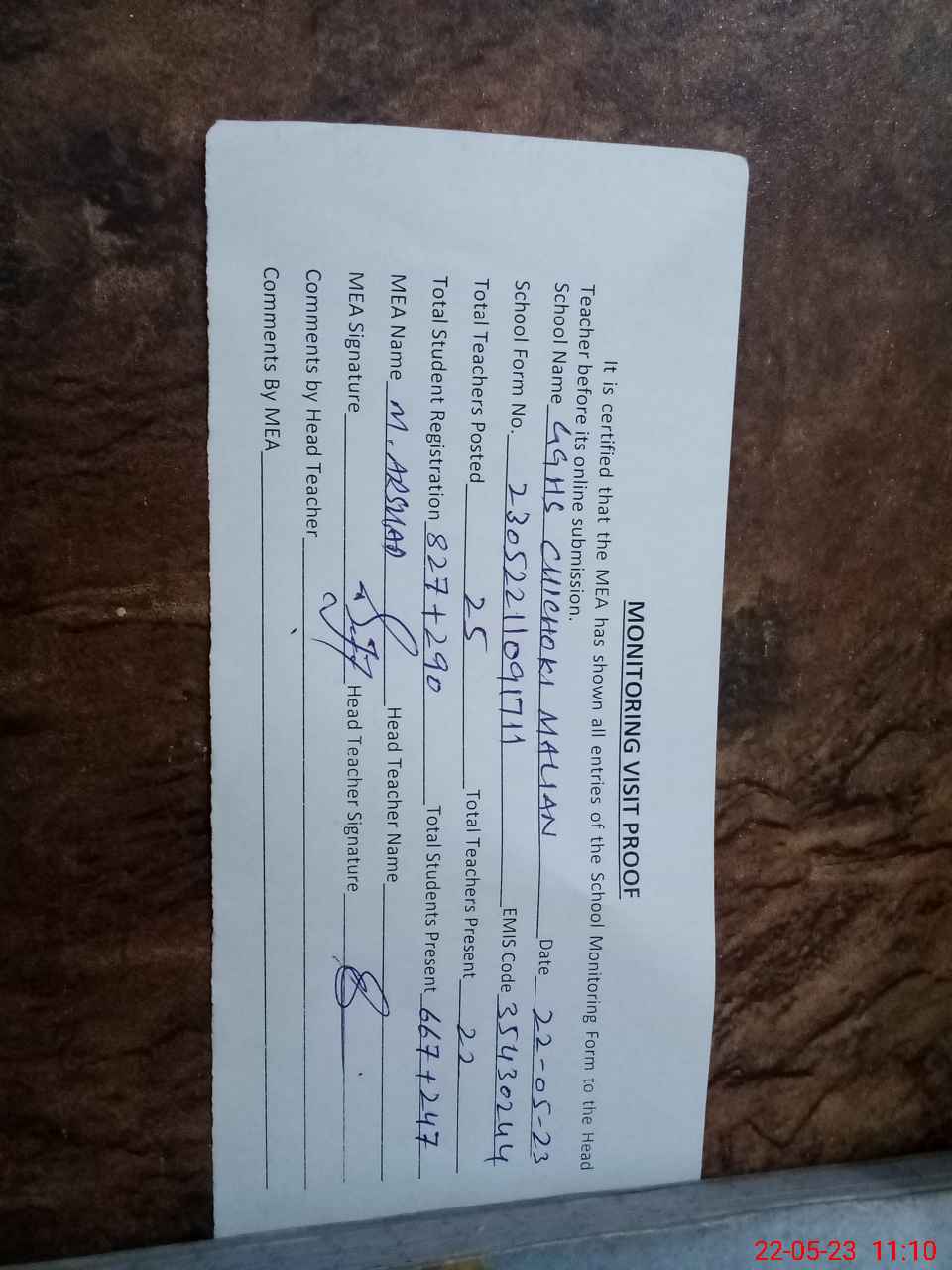 | Attendance Register | Head Teacher | MEA with School | Visit Proof |