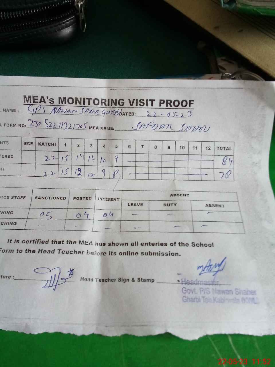 | Attendance Register | Head Teacher | MEA with School | Visit Proof |