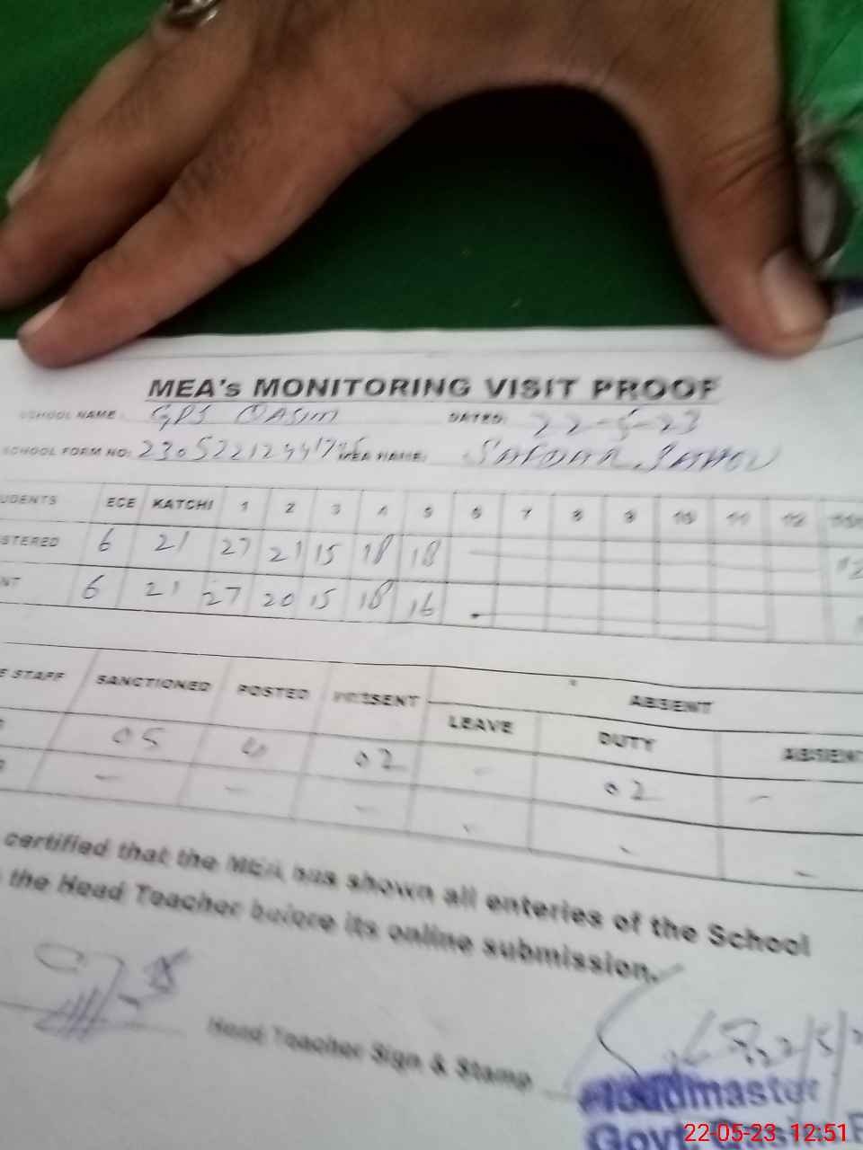 | Attendance Register | Head Teacher | MEA with School | Visit Proof |
