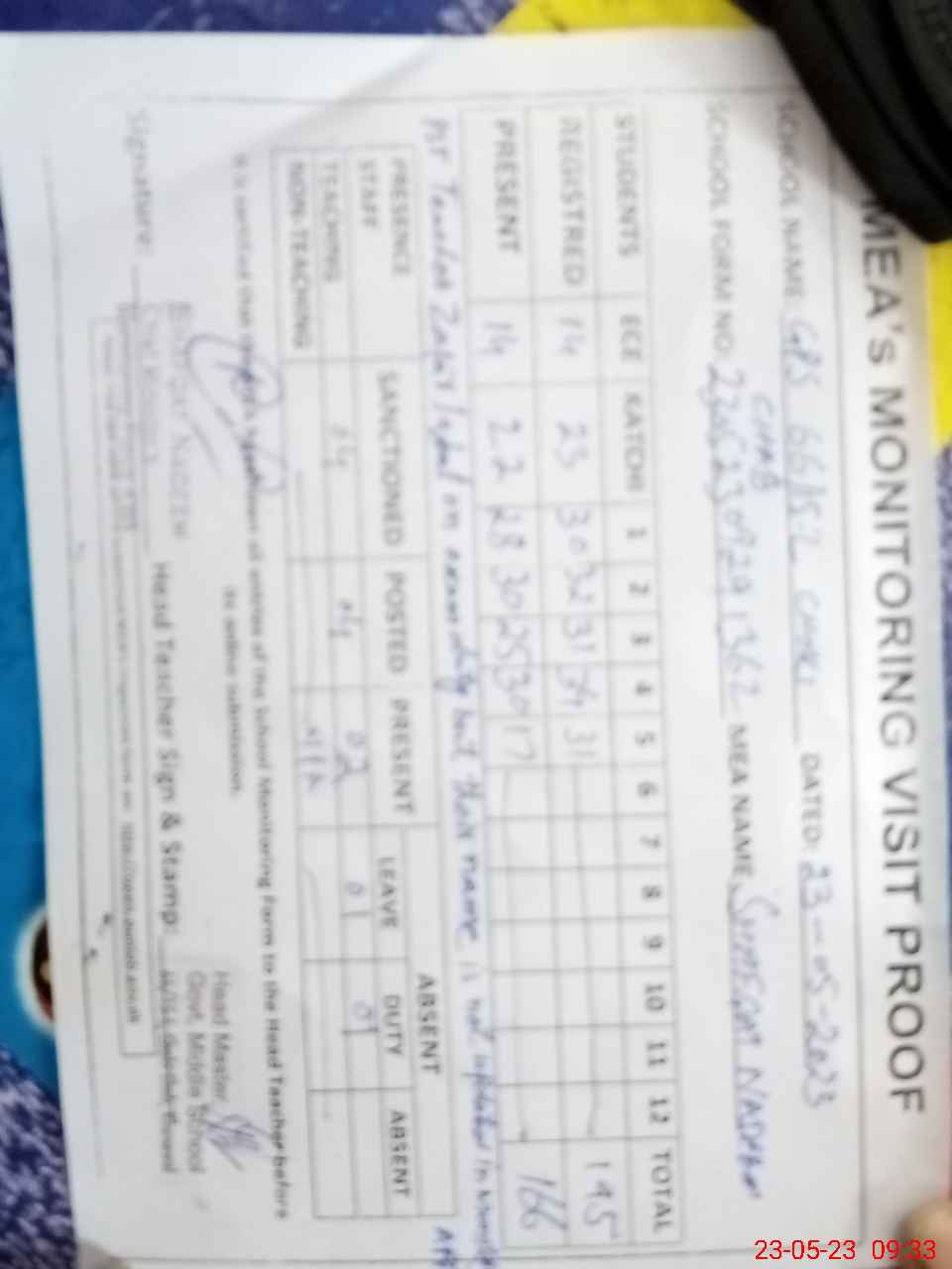 | Attendance Register | Head Teacher | MEA with School | Visit Proof |