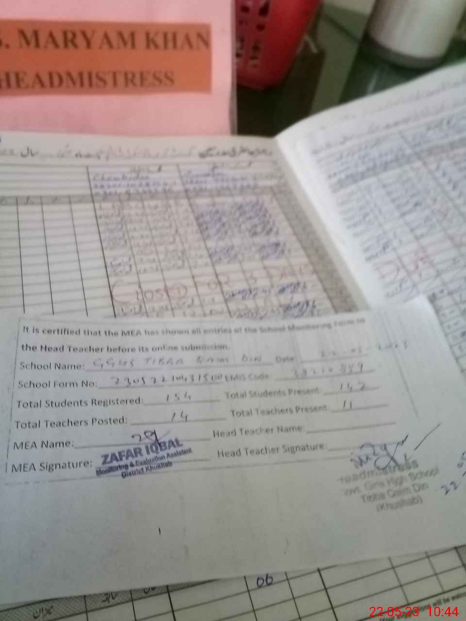 | Attendance Register | Head Teacher | MEA with School | Visit Proof |