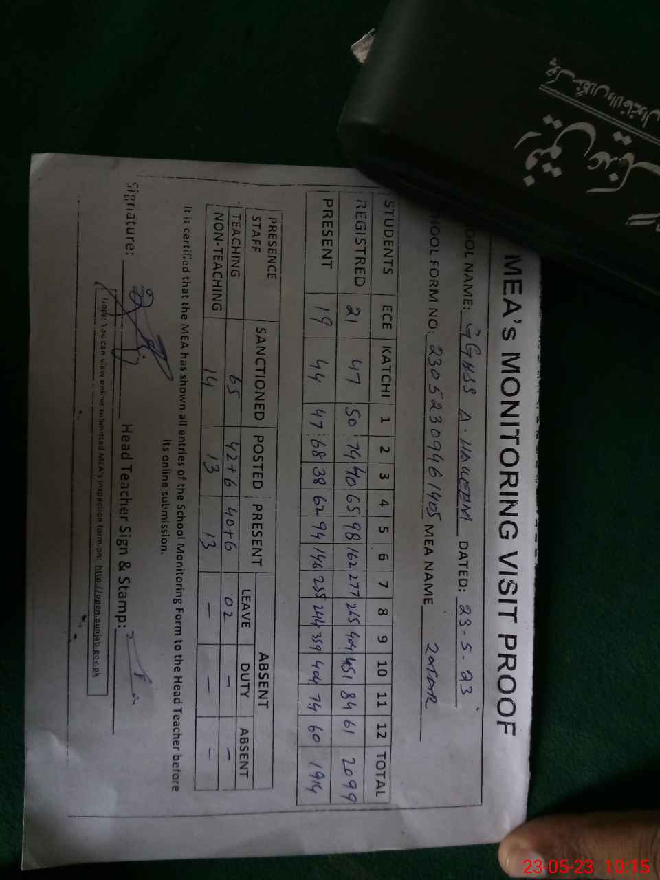 | Attendance Register | Head Teacher | MEA with School | Visit Proof |