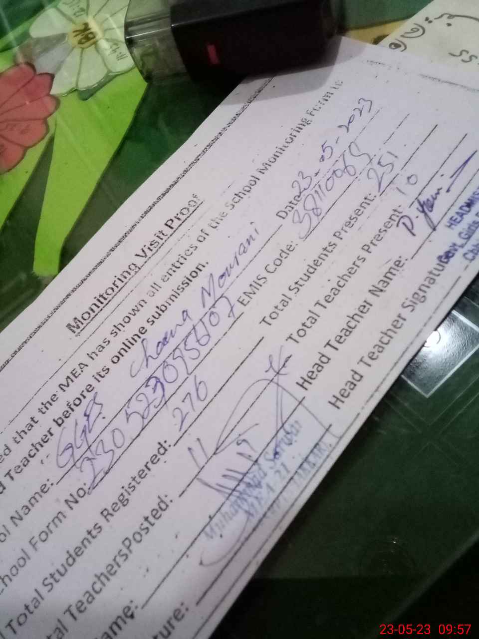 | Attendance Register | Head Teacher | MEA with School | Visit Proof |
